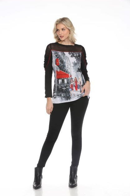 Fashionable top with eye-catching design. The soft black meshwork at the shoulders brings a modern flair to this original top.